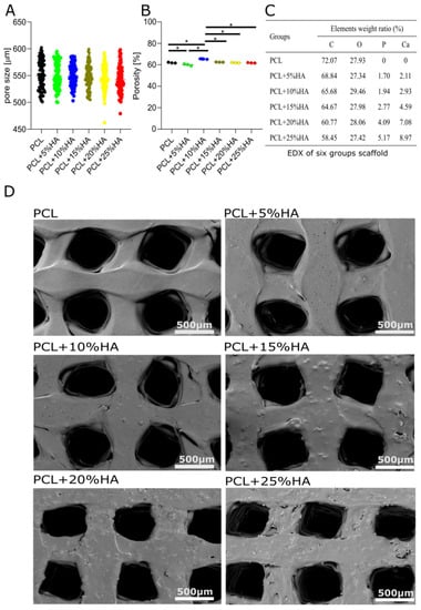 The pore sizes of scaffolds containing different HA content remained constant (not significantly different from 550 µm). The porosity rate exhibited a smaller oscillation range, with PCL + 10% HA showing the highest porosity (65.4 ± 0.3%, * = p < 0.05) and PCL + 5% HA the lowest (60% ± 0.9%, * = p < 0.05) versus the control and the other groups (Figure 3A,B). Despite the statistical significance, the porosity of all six groups’ scaffolds was around 60%. SEM was used to obtain the morphology (Figure 3D). The images revealed that all six groups of scaffolds displayed highly interconnected pore structures. Additionally, the structure appeared rougher the more HA was included. To verify whether this correlated with the increased incorporation of HA, EDX was conducted for each group. From the EDX, we analyzed the percentage of HA on the surface of scaffolds. The EDX analysis revealed that the weight ratio of calcium (Ca) and phosphorus (P) increased concomitantly with the increasing amounts of HA included (Figure 3C).