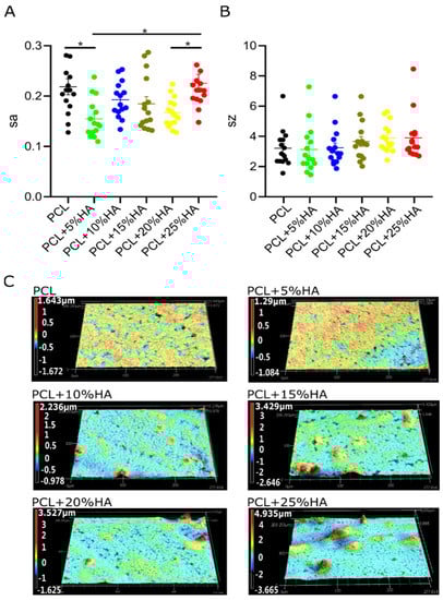 Surface roughness parameters Sa (arithmetical mean height) and Sz (maximum height) are displayed in Figure 4. The PCL + 25% HA group showed the highest mean Sa (ca.0.25), and the PCL + 5% HA group showed the lowest mean Sa value (ca.0.15), with statistical differences from the control PCL (* = p < 0.05). Regarding Sz, although no statistical differences were recorded between the groups (n.s. = p > 0.05), the values increased with the increased HA content.