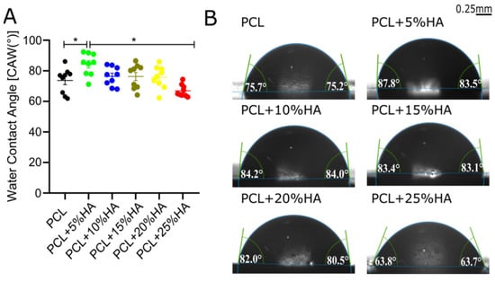 Water contact angles were highest for the PCL + 5% HA group (84 ± 7.2°, * = p < 0.05) versus the PCL control. In contrast, the PCL + 25% HA group showed the best hydrophilic performance (67 ± 3.9°, * = p < 0.05) versus the PCL + 5% HA group (Figure 5A). Contact angles of intermediate HA content were not statistically significant from the PCL control. Water drops on all solid specimens are displayed in Figure 5.