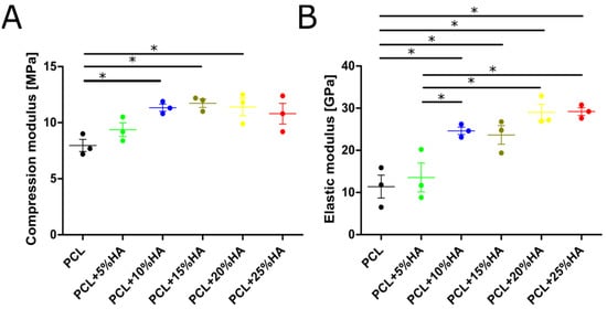 Every scaffold was tested until it reached 20% deformation. The PCL control group showed the lowest MPa value (8 MPa). Compression values proportionally increased with 5% and 10% HA contents (to 9 and 11 MPa, respectively). When comparing PCL + 10%, 15%, and 20% HA groups, they were statistically significant compared with the control (p < 0.05), but not compared with each other, reaching a plateau of compression around 11 MPa (Figure 6A). The 25% HA group only exhibited significance approaching that of PCL. The elastic modulus increased with increasing HA content, following the same trend seen in the uniaxial compression tests. Scaffolds including 10%, 15%, 20%, and 25% HA had a mean elastic response between 24 and 30 GPa (Figure 6B).