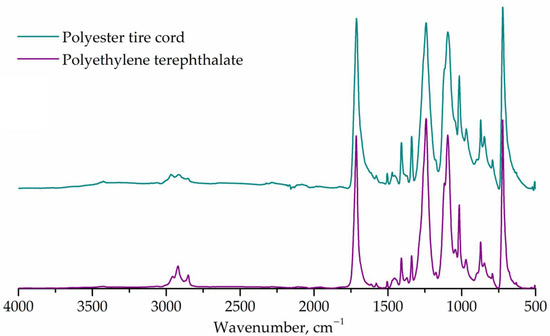Modern tire cord mainly consists of the polyethylene terephthalate [4,5]. The composition of the cord used in this work was confirmed by the correlation of the FTIR spectra of mechanically purified cord and PET. The spectra were obtained by means of Spectrum 65 FT-IR spectrometer (Perkin Elmer, Waltham, MA, USA).