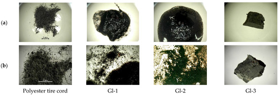 Photos of polyester tire cord and samples Gl-1, Gl-2, Gl-3: (a) macro; (b) micro.