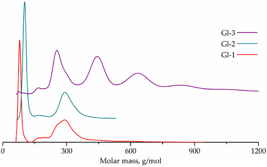 The product of glycolysis is present predominantly in the liquid phase. Since the product is not only BHET, but also oligomers, the yield of BHET itself cannot serve as a characteristic of the glycolysis depth and the latter was estimated by GPC. Liquid phase GPC curves of Gl-1 and Gl-2 samples and main phase of Gl-3 sample are shown in Figure 4.