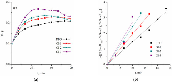 Kinetic curves of the swelling of RBD, Gl-1, Gl-2, and Gl-3 samples are shown in Figure 5.