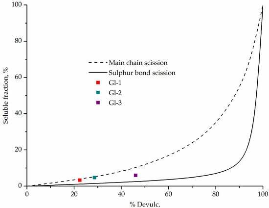 The Horikx plot was used to evaluate the relationship between crosslinks and backbone chains degradation (Figure 6). It was found that both degradation and devulcanization processes took place in all samples. A larger soluble fraction in the rubber sample obtained during the novel glycolysis process (Gl-3) is compensated by a larger decrease in crosslink density.