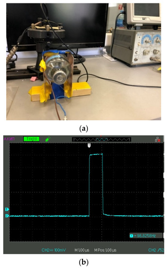 Panel (a) irradiation of a test liquid in a flat capacitor. Panel (b) the shape of an electric pulse applied to the plates of the capacitor.