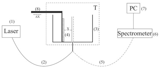 Schematic of the experimental setup for laser luminescence spectroscopy. (1) laser diode; (2) optical fiber; (3) cylindrical cell; (4) Nafion plate; (5) quartz fiber; (6) minispectrometer; (7) computer; (8) stepping motor; T–thermostat.