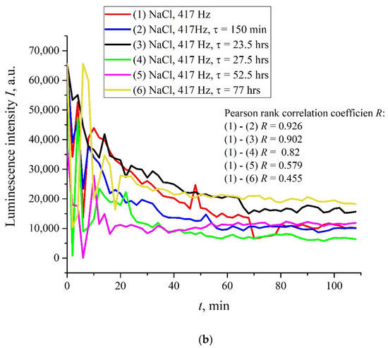 The intensity I(t) for isotonic NaCl solution after processing at the 417 Hz pulse repetition rate. The difference between the graphs in panels (a,b) is that the measurements were made in different laboratories; the distance between the laboratories is 20 km. Here, τ is the time interval between the beginnings of the corresponding measurements. Pearson rank correlation coefficient was calculated for all values of τ.