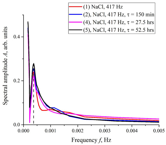 Results of the Fourier transform of I(t) dependences shown in Figure 6b. The frequency dependences of the spectral amplitude, A(f), were obtained using the Morlet wavelet transform. The dashed line marks the central frequency of the spectral maximum.