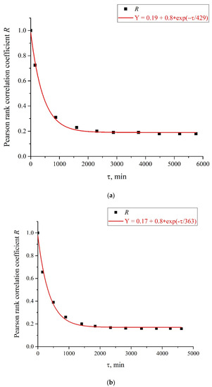 Here C and B are the constants, f0 is the central (resonant) frequency, and τcorr is the correlation time of random process with the Lorentzian spectral line; the Lorentzian contour width is Δf~(τcorr)−1, see [36]. In Figure 8, we show the dependence, A2(f), for the curve, A(f), shown in Figure 7 for τ = 52.5 h. In Figure 9a,b, we exhibit the dependences of the Pearson rank correlation coefficient, R, vs. time, τ. A detailed description of the methods for calculating the Pearson rank correlation coefficient can be found in the hyperlink [37]. In our case, Pearson’s correlation coefficient, when applied to a sample, is described by the formula: