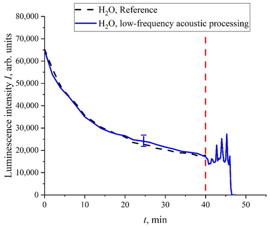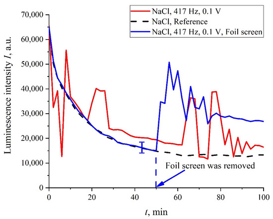 In addition, in some experiments we wrapped the flask containing the liquid sample with 10 μm-thick aluminum foil, and the sample was treated with electric pulses at 417 Hz repetition frequency. The results of this experiment are shown in Figure 10. It is seen that, in this case, no stochastic behavior was observed, and the luminescence intensity, I(t), coincides with a good accuracy with the reference curve. This is quite expected: the treatment effect in this case is absent due to the screening of the liquid sample.