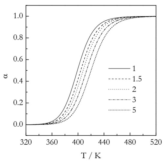 To look closer into the use of χ(T) for estimating the Arrhenius parameters as well as the Ozawa–Avrami model in general, we simulate processes of two types: one that obeys the Avrami model with n = 3 and another that follows the second-order kinetics model. These models are commonly denoted as A3 and F2, respectively. Note that the reaction-order kinetics are routinely encountered in crosslinking polymerizations as seen in examples publicized elsewhere [28,29,30]. Both processes have the same Arrhenius parameters: E = 100 kJ mol−1 and A = 1012 min−1 (i.e., lnA = 27.63) and are simulated in the form of α vs. T curves at five heating rates: 1, 1.5, 2, 3, and 5 K min−1. This is accomplished by solving the following equation for α: