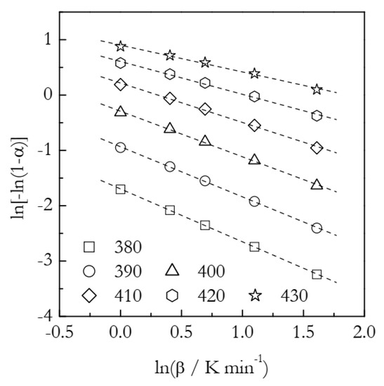 where β is the cooling or heating rate and χ(T) is, respectively, the cooling or heating function. The parameter n is sometimes confusingly called the Ozawa exponent, but in fact is the Avrami exponent [43]. The method makes use of the isothermal sections of the non-isothermal data. That is, one selects temperature and then determines what values of α correspond to this temperature at different values of β. Then, n and χ(T) are readily evaluated using Equation (10):