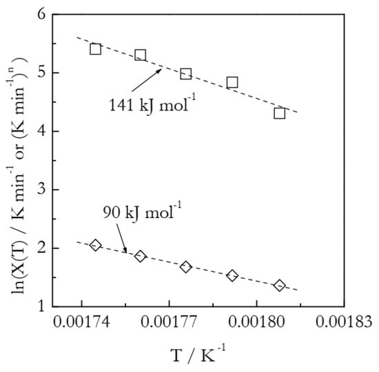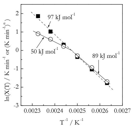 Figure 9 presents the Arrhenius plots based on the heating function data (Table 3). The lnχ(T) vs. T−1 plot yields the activation energy 141 kJ mol−1, which is 65% larger than the value found in our previous work by using an advanced isoconversional method (Equations (16) and (17)). As established in the analysis of the simulated A3 and F2 data, more reasonable Arrhenius parameters are obtained while employing the lnχ(T)/n vs. T−1 plots. Indeed, the resulting E is 90 ± 3 kJ mol−1 and lnA is 20.9 ± 0.6. In agreement with the simulated results, the estimated E value is larger than the correct one by ~6%. In turn, the estimated lnA value is larger by ~12%.