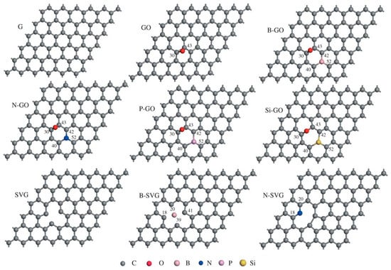 The supercell models of pristine and functionalized graphene sheets. Reproduced with permission from []. Copyright 2018, Royal Society Chemistry.