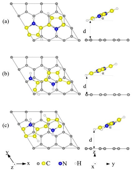 Özkaya, and Blaisten-Barojas [] established for their study of polypyrrole on graphene using DFT that the results emphasize that polypyrrole (PPy) physisorbs onto the graphene surface; PPy physisorption on graphene happens at a distance of 3.5° A and a 23° tilt angle “α” (Figure 2); the PPy-graphene nanocomposite band structure does not possess an energy band gap opening at the Dirac point; PPy-graphene composite physisorption produces an electronic density rearrangement along the polymer backbone only; and a second graphene layer atop of PPy does not disturb the aforementioned results [].