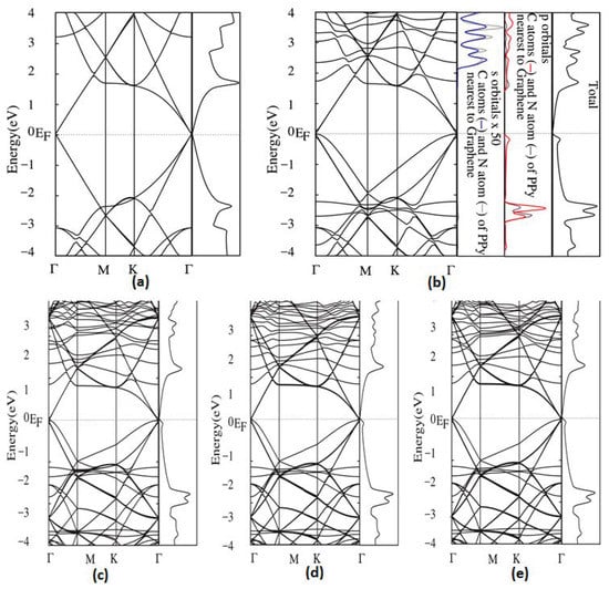 With regards to graphene-based composites, the graphene-polypyrrole nanocomposite-film band structure has been studied as reported by Özkaya, and Blaisten-Barojas [] using DFT calculations. They observed that the fundamental phenomenon of the PPy adsorption further investigated using computations of the band structure as well as DOS as shown in Figure 3 is the band structure of pristine graphene and PPy/graphene polymer composite estimated within the PZ-GGA technique. Their calculations revealed that virgin graphene exhibited zero band gap, as expected []. Their overall band structure for graphene (3 × 3), as they reported, was in agreement with other theoretical report findings []. They denoted that band gap absence at the Fermi energy was initiated by the merging of valence and conduction bands at the Γ-point in the Brillouin region/zone, and the typical linear band and a secondary band are exhibited by two graphene bands. These authors also reported that the band structure around the Dirac point adsorption was affected by the PPy chain via opening a very slight energy gap of 0.008 eV on the secondary band, although not on the graphene proto-classical linear band []. Nevertheless, as depicted in Figure 3, the DOS of graphene and PPy on graphene are different, most particularly by the emergence of the peak below the Fermi energy due to the PPy presence; the anticipated density of states (PDOS) upon the PPy atoms indicates this peak is due to the p-orbitals of PPy carbon atoms as in Figure 3b, revealing the weak π orbital interface with graphene. Furthermore, the authors stated that the PDOS demonstrated that the p-orbitals of PPy carbon and nitrogen atoms influenced the bands between −2 and −3 eV, whilst their s-orbitals give rise to the DOS structure revealed between 2 and 4 eV [].