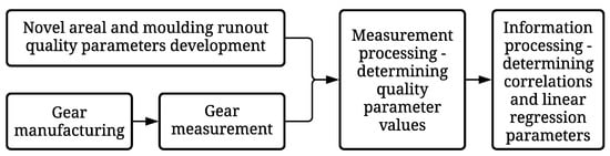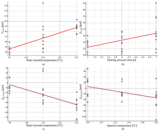 - The influence of the moulding process parameters on the new quality parameters was investigated. The rate of cooling was determined to be the most influential factor for the shrinkage of the gears, which we were able to determine through the parameter . The study also determined the linear regression coefficients for the new quality parameters, based on Spearman’s correlation coefficient. The results and coefficients are valid for the investigated range of the process parameters and the used material, outside this range further testing should be carried out to confirm their validity.