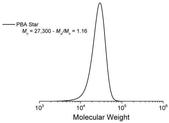 The synthetic protocol used to prepare the PBA star polymer was modified from a previously reported procedure []. BA (13.26 g, 104 mmol), 4f-BiB (0.2 g, 0.260 mmol), CuBr2 (2.3 mg, 0.01 mmol), Me6TREN (0.014 g, 0.062 mmol), DMF (12 mL), and anisole (45 mL) were added to a 100 mL Schlenk flask equipped with a magnetic stir bar. The contents of the flask were degassed by three cycles of freezing in liquid nitrogen, followed by evacuation under vacuum, then thawing to room temperature. The flask was refilled with nitrogen in the final round. An initial aliquot was taken from the reaction mixture for characterization by 1H NMR. The photoATRP was started at room temperature by exposing the flask to light of λmax = 374 nm at an intensity of 7.2 mW/cm2 overnight [,]. Upon completion, the reaction was quenched by turning off the light and exposing the reaction to air. An aliquot of the final reaction mixture was taken for analysis by 1H NMR, confirming a conversion of 58% (Mn, th = 30,500, DPsc = 58). The crude reaction mixture was diluted with THF and filtered through basic alumina to remove residual catalyst. Extra solvent was removed by rotary evaporation. The sample was allowed to air-dry before analysis by GPC. The stars were isolated as a transparent viscous liquid.