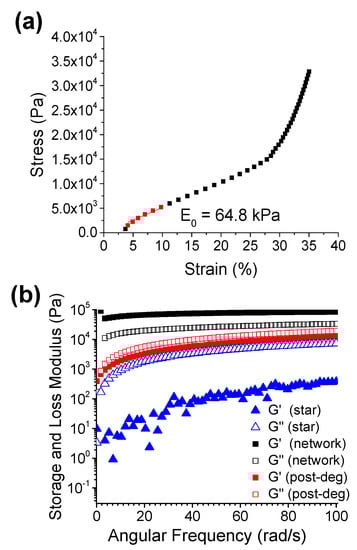The modulus of the cured polymer network was 64.8 kPa, as determined by a compression test at ambient temperature (Figure 2a). The successful crosslinking reaction was confirmed by frequency sweep across a frequency of 0.01–100 rad/s at an applied strain of 1 N (Figure 2b). The storage modulus (G′) values were greater than the loss modulus (G″) across the range of frequencies, confirming a solid but rubbery character of the crosslinked elastomer. In contrast, the original PBA stars behaved as a soft, viscous liquid because PBA is significantly above its glass transition temperature (Tg = −55 °C) at room temperature.