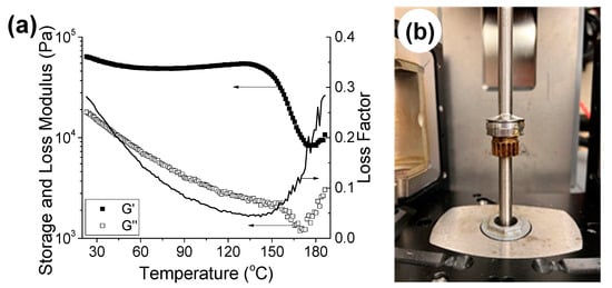 (a) Temperature sweep of the PBA elastomer from a temperature of 25 to 190 °C. The loss factor is the tan δ = G″/G′. The sweep was conducted at a frequency of 10 rad/s and a constant applied shear strain of 0.1%. The applied normal force was 1 N. (b) Picture of the DMA set-up after network degradation during the temperature sweep experiment. The degraded network became a liquid which flowed over the side of the sample plate.