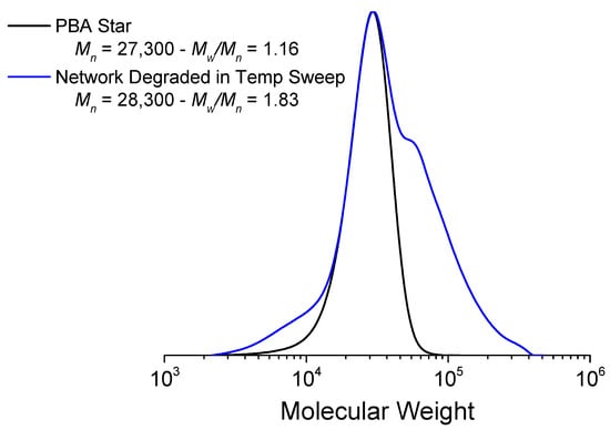 GPC trace of the degraded network after the temperature sweep overlayed with the trace of the PBA4Br star polymer precursor. The molecular weight is relative to linear PMMA standards in THF.