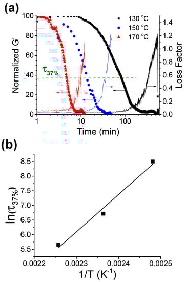 Stress relaxation experiments were performed at 130, 150, and 170 °C using polymer networks cured using an identical recipe to characterize the rate of alkoxyamine decomposition at an applied strain of 0.1% (Figure 5a). Similar to the temperature sweep experiment, polymer networks exposed to elevated temperatures at the same applied strain were observed to degrade by a concurrent decrease in storage moduli and an increase in loss factor after sample degradation. As expected, the rate of sample degradation increased with the relaxation temperature, in agreement with the increase in the rate of alkoxyamine decomposition observed in other reports. Networks degraded after nearly 2 h at 130 °C. The decomposition was shortened to 20 min at 150 °C, and ~7 min at 170 °C. A quantitative measurement of the temperature-dependent viscous flow of a network with exchangeable crosslinks was determined by an Arrhenius plot of the characteristic relaxation time (τ37%) vs. temperature. The τ37% is defined as the time when G′ = 0.37G′0. The Arrhenius plot was linear for the polymer networks over the tested temperature range, providing an Ea = 106.0 ± 12.4 kJ/mol (Figure 5b), a value comparable to the reported Ea of thermal cleavage of typical alkoxyamines [].