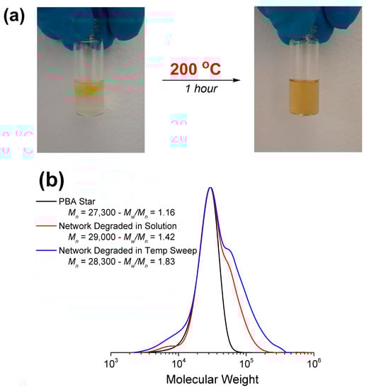 (a) The crosslinked network was swollen in 1,2,4-trichlorobenzene (40 mg sample/2 mL solvent) and heated at 200 °C for 60 min. (b) The GPC of PBA star polymer precursor and soluble components after degradation.