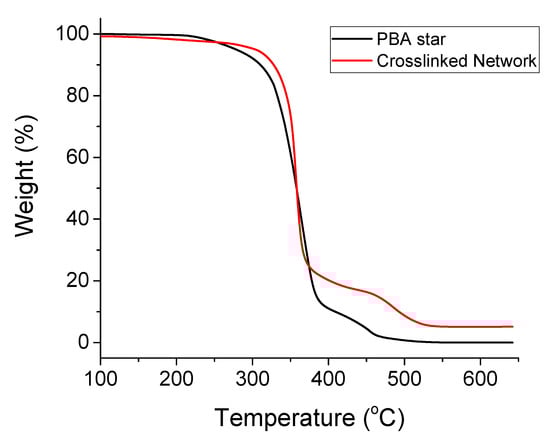 The TGA traces of the network in Figure 7 showed that the network had Td,10% = 328 °C, comparable to the Td,10% = 310 °C of the PBA star precursor, which further supported degradation of alkoxyamines as the route of primary degradation. The crosslinked network had a higher tendency toward char formation, which may be attributed to differences in end-group functionality [].
