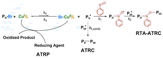A radical trap can be used to install an alkoxyamine bond during the coupling reaction via the radical trap-assisted atom transfer radical coupling (RTA-ATRC) approach (Scheme 1). In RTA-ATRC, the polymer macroinitiator prepared by ATRP is activated by the ATRP catalyst to yield a chain-end radical which is trapped by a TEMPO radical trap [,] or nitroso compound (i.e., nitrosobenzene) [,,,,,,,]. The latter reaction yields a polymer with terminal nitroxide CEF capable of trapping a second macroinitiator to yield a coupled polymer with an alkoxyamine functional group at the center. This approach was also used to prepare high molecular weight linear polymers, branched polymers, block copolymers, and cyclic copolymers [,,,,,,,].