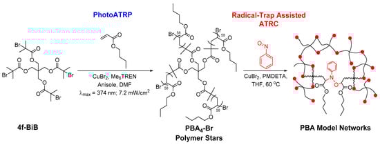 n-Butyl acrylate (BA, 99%, Aldrich, St. Louis, MO, USA) was passed through basic alumina column to remove radical inhibitors prior to use. Anisole (Aldrich, 99%), nitrosobenzene (NBz, 99%, Aldrich, St. Louis, MO, USA), α-bromoisobutyryl bromide (BiBBr, 98%, Aldrich, St. Louis, MO, USA), pentaerythritol (for synthesis Aldrich, St. Louis, MO, USA), tin (II) ethylhexanoate (Sn(EH)2, 98%, Aldrich, St. Louis, MO, USA), tetrahydrofuran (THF, ACS grade, Fisher Scientific, Hampton, NH, USA), copper(II) bromide (CuBr2, 99%, Aldrich, St. Louis, MO, USA), N,N-dimethylformamide (DMF, ACS grade, Fisher Scientific, Hampton, NH, USA), deuterated chloroform (CDCl3, 99.8%, Cambridge Isotope Laboratories, Tewksbury, MA, USA), and tris [2-(dimethylamino)ethyl]amine (Me6TREN, Aldrich, St. Louis, MO, USA) were used as received.