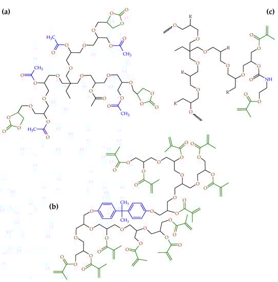 The hyperbranched polyethers can be also converted into new, low-viscosity and low-oxygen-inhibition hyperbranched multimethacrylate macromonomers capable of photopolymerization, for application in dental composites [59]. Two types of multimethacrylate resins have been studied in the CCTP—one based on a bisphenol A core and polyether branches (Figure 1b), and the other one based on TMP and containing urethane bonds (Figure 1c). The macromonomers were characterized by spectroscopic methods and the conversion of double bonds was investigated by FTIR. The physical properties of the multimethacrylate resins, such as viscosity, density, and polymerization shrinkage, were determined as well. The obtained results showed that such resins are attractive materials to use in composites, especially dental ones.