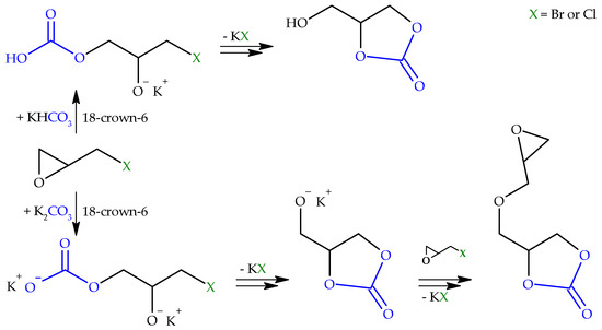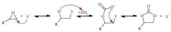 As already mentioned, the basic method for the synthesis of five-membered cyclic carbonates is the reaction of oxiranes with carbon dioxide. These reactions are carried out in the presence of catalysts, which are most often metal complexes, organic halides, or ion-exchange resins [13]. Our group developed a very effective catalytic system comprising crown ethers and alkali metal halides (e.g., KI), which enables, in many systems, the almost quantitative insertion of CO2 into an oxirane ring [13,17,18,19,20]. The catalytic effect of the metal halide in this reaction can be explained by the mechanism involving the halide anion attack on the α-carbon atom of the oxirane ring, resulting in the formation of the alcoholate ion—the latter captures the CO2 molecule and finally is transformed into a cyclic structure via an intramolecular nucleophilic substitution reaction (Scheme 2).