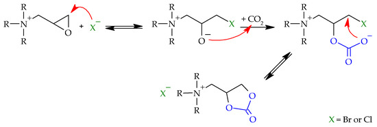 Mechanism of the CO2 fixing by oxiranes with a quaternary ammonium cationic center.