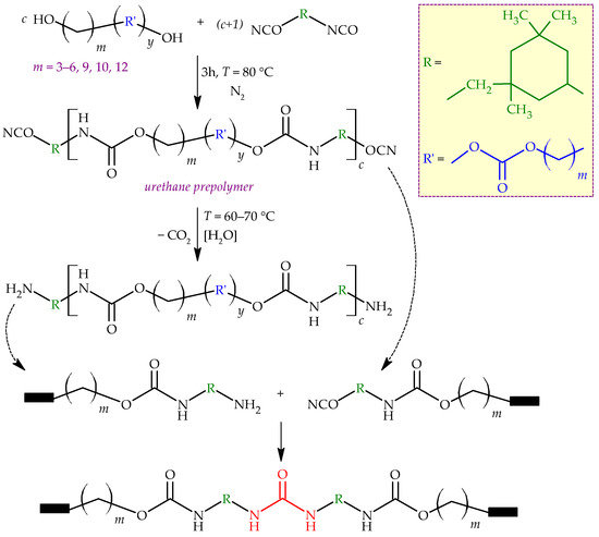 The results of studies conducted in the CCTP indicate that oligo(alkylene carbonate)s can be applied as precursors of poly(carbonate-urea-urethane) (PCUU) soft segments. The syntheses is carried out without a solvent or catalyst, using aliphatic diisocyanate such as isophorone diisocyanate (IPDI) or hexamethylene diisocyanate (HMDI), with water vapor as a precursor of the chain extender (Scheme 6) [22,23]. The influence of the hydrocarbon chain length between the carbonate groups in oligo(alkylene carbonate)s on the final chemical structure, as well as the thermal and mechanical properties of poly(carbonate-urethane)s, was investigated [26]. It has been shown that products based on decamethylene and dodecamethylene oligocarbonates have lower crosslinking density (both covalent and physical) and higher content of the crystalline phase. Due to the presence of long hydrocarbon chains between their carbonate linkages, such polymers exhibit a higher elongation at break and lower glass transition temperature (Tg). Moreover, some significant differences in the properties of the products related to the parity number of methylene groups between carbonate groups are also observed. For example, a characteristic minimum in the relationship between the Tg of the polymer and the number of CH2 groups in its repeating unit occurs in the case of PCUU derived from 1,9-nonanediol. Our studies indicate that urethane prepolymers containing lower concentrations of hydrocarbon fragments are also characterized by lower water vapor permeability, which leads to a much slower moisture-driven curing process. Because of this, the reaction of isocyanate groups with urethane and urea linkages proceeds to a higher extent and, as a consequence, the concentration of allophanate and biuret groups in such samples is higher.