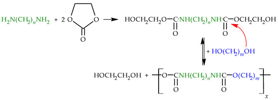 In the CCTP, another kind of polycondensation method for NIPU synthesis was proposed that utilized aliphatic α,ω-diamines, α,ω-diols, and ethylene carbonate as monomers [44]. Firstly, in the reaction of diamine with ethylene carbonate alkylene, bis(2-hydroxyethylcarbamate)s are formed, which subsequently undergo a transurethanization reaction with α,ω-diol (Scheme 8). The whole process is carried out at 145–150 °C in the presence of a tin catalyst (e.g., dibutyltin oxide, Bu2SnO), resulting in [n,m]-polyurethane and a side product, ethylene glycol, which is readily removed from the reaction mixture under a vacuum.