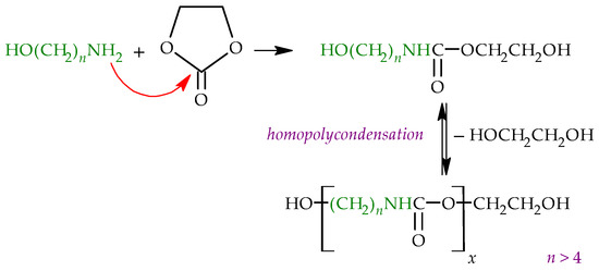 Alternatively, α,ω-aminoalcohol containing four and more CH2 groups in a molecule can be utilized instead of diamine and diol, leading to the formation of [n]-polyurethane as the transurethanization product (Scheme 9) [44]. It is worth noting that, in addition to urethane linkages, there is a small quantity of urea linkages present in the backbone of the obtained polymer.