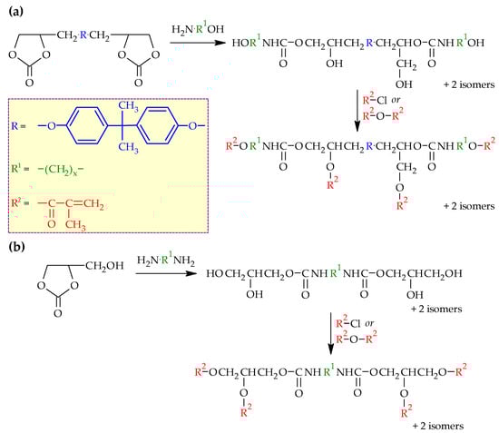 The same approach was applied for the modification of epoxy resins cured with aliphatic polyamines [17,47]. It should be mentioned that this bis(cyclic carbonate) can be also used for obtaining high-molecular-weight poly(hydroxy-ethers) via its reaction with various bisphenols; in contrast to a typical method based on the diglycidyl ether of bisphenol A, in this new synthetic pathway, side reactions are greatly suppressed [48].