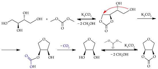 A one-pot synthetic route to tetrahydrofuran derivatives, which were unexpectedly produced under basic conditions by the intramolecular etherification of substituted five-membered cyclic carbonates, was developed in the CCTP [52]. When meso-erythritol containing four vicinal hydroxyl groups is reacted with DMC at the stoichiometric ratio at 90 °C, (3R,4S)-3,4-dihydroxytetrahydrofuran is obtained with 86% yield. However, when the reaction is carried out with molar excess of DMC under the same reaction conditions, a bicyclic derivative of tetrahydrofuran and 1,3-dioxolan-2-one forms almost quantitatively (yield 96%) (Scheme 12). Furthermore, by replacing erythritol with D-mannitol or D-sorbitol, one can synthesize in this process bis(cyclic carbonate)s (Scheme 13).