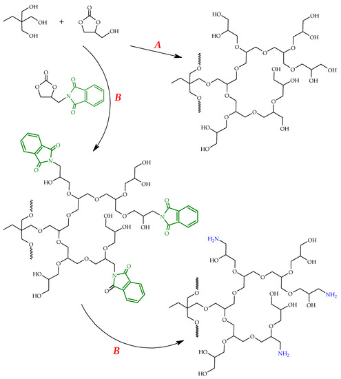 Glycerol carbonate undergoes also copolymerization with cyclic carbonate-bearing phthalimide groups, namely N-[(2-oxo-1,3-dioxolan-4-yl)methyl]phthalimide (Scheme 15, path B). The obtained polymer, after hydrazinolysis of phthalimide moieties, yields hyperbranched aliphatic polyethers containing hydroxyl and amine end groups [57]. During such a process, an intermediate, glycidol, is formed and acts as an initiator or monomer.