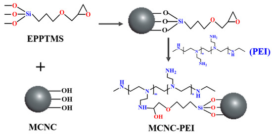 MCNC-PEI was prepared as follows: EPPTMS was grafted onto the surface of MCNC via hydrolysis of the silanol groups and hydroxyl. Specifically, MCNC (1 g) and EPPTMS (0.75 g) were added to the 50 mL dimethylformamide (DMF) solution (containing 2 mL of water), and the mixture was stirred at 80 °C for 24 h under condensation reflux, which yielded MCNC-EPPTMS. Then, the reaction continued, following the addition of 1 g of PEI. After 24 h, the product was separated using a magnet and washed with DMF and ethanol. The adsorbent was finally freeze-dried for further study [30].