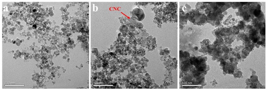 MCNC was prepared using a coprecipitation method. Specifically, 2 g of CNC was uniformly and ultrasonically dispersed in deionized water for 5 min. Subsequently, an N2 atmosphere was introduced into the dispersion to remove the O2. Then, FeCl3 (4.8 g) and FeCl2 (1.8 g) were added to the dispersion, the temperature of the reaction system was maintained at 75 °C, and the pH was adjusted to 9 using ammonia. The pH value was measured using a pH test paper by dropping a small amount of reaction solution onto the test paper. The reaction proceeded for 30 min. The product was consecutively washed with water and ethanol and then freeze-dried [29].