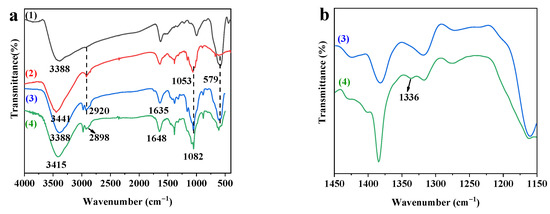 (a) FTIR spectra of (1) Fe3O4, (2) CNC, (3) MCNC, and (4) MCNC-PEI; (b) FTIR spectra of (3) MCNC and (4) MCNC-PEI at the wavenumber range of 1450–1150 cm−1.