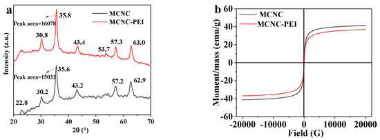 XRD was used to reflect the changes in crystal structure within the composite adsorbent. As shown in the Figure 4a, the diffraction peak at 22.8° corresponds to the crystal plane (002) of CNC [37]. The six diffraction peaks at 30.2°, 35.6°, 43.2°, 53.7°, 57.2°, and 62.9° correspond to the crystal plane of Fe3O4 (220), (311), (400), (422), (511), and (440), respectively [38,39]. When MCNC was modified using the silane coupling agent and PEI, the diffraction peak at 62.7° increased to a larger angle, indicating that the particle size of MCNC was larger than that of MCNC-PEI, which is consistent with the conclusion of TEM analysis.