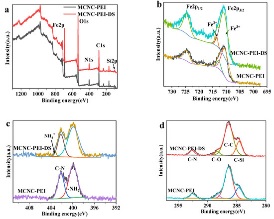 XPS spectrum of MCNC-PEI and MCNC-PEI loaded with DS. (a) Full spectrum; (b) Fe2p; (c) N1s; and (d) C1s.