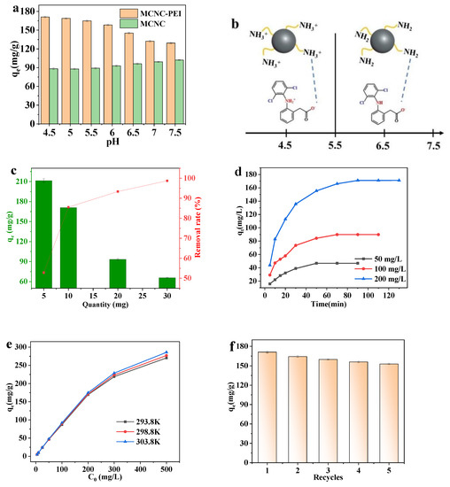 (a) Effect of PH on the adsorption capacity of MCNC and MCNC-PEI for DS; (b) schematic of the adsorption mechanism of MCNC-PEI for DS; effect of (c) adsorbent dosage, (d) adsorption time, and (e) initial concentration of DS on adsorption capacity; and (f) effect of recycling time on the adsorption capacity of MCNC-PEI for DS.
