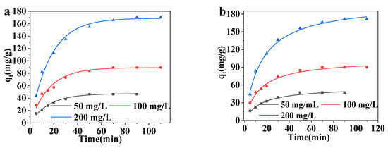The time taken for adsorption to reach equilibrium was closely linked to the concentration of DS. The adsorption capacity of DS at different adsorption times was studied, with concentrations of DS ranging from 50 to 200 mg/L; the results are shown in Figure 6d. As the DS concentration increased, the time required for adsorption to reach equilibrium also increased. When the concentration was 50 mg/L, it took 30 min for adsorption to reach equilibrium and up to 90 min at a DS concentration of 200 mg/L. In addition, a higher concentration of DS caused a greater adsorption capacity of MCNC-PEI for DS. The adsorption process is the capture process of DS by MCNC-PEI; therefore, a high DS concentration prolongs the capture process.