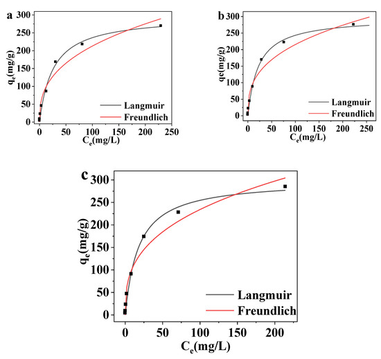 where qm (mg/g) represents the maximum adsorption capacity of MCNC-PEI, KL (L/mg) is a constant for the adsorption affinity; and n and KF (mg/g) are the adsorption strength and constant, respectively.