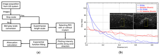 (a) Flowchart showing the attenuation analysis procedure used in this study. US images were exported to ImageJ (NIH open-source software) to scale the measurements, selecting the region of interest (ROI) and exponentially fitting the intensity profile at 6.5 MHz frequency. (b) Representation of exponential fit of selected ROI of two different B-mode images of baseline (left) and PCSA (right) at 6.5 MHz frequency.
