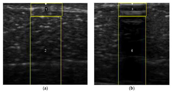 (a) Selection of ROI-1 and ROI-2 in the B-mode image of the muscle without implants. (b) Selection of ROI-3 and ROI-4 in the B-mode image with aerogel implants.